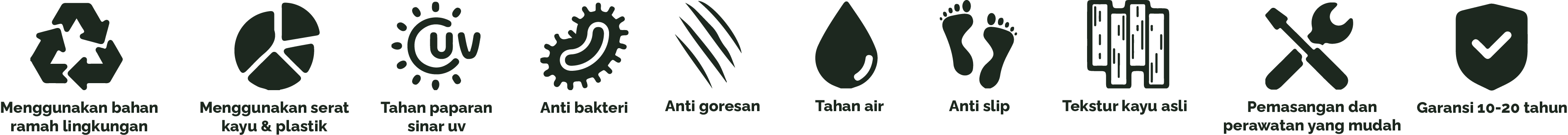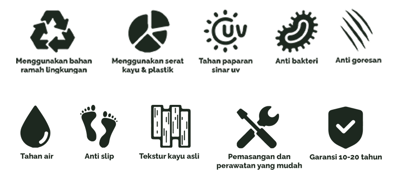 Berbahan WPC sehingga berumur panjang dan bertahan lama walapun saat terkena sinar uv dan air hujan.